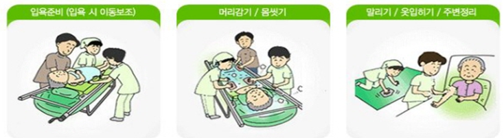방문목욕은 노령 또는 중증장애로 거동이 불편하여 스스로 목욕을 하지 못하는 대상자에게 목욕서비스를 제공함으로써 신체적 청결과 근육경축예방 및 심신 기능을 향상시키고 안정된 생활을 유지시켜 줍니다.